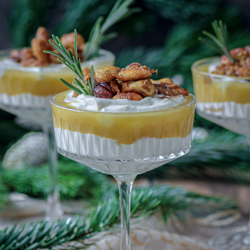 3. Apfelmus und Creme abwechselnd schichten, mit Nusskrokant toppen – genießen.